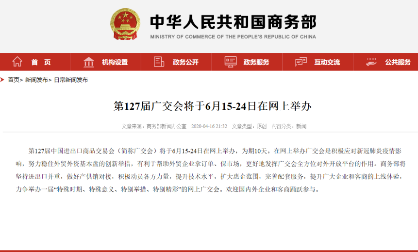 4月16日,商務(wù)部正式官宣,第127屆中國(guó)進(jìn)出口商品交易會(huì)(簡(jiǎn)稱(chēng)廣交會(huì))將于6月15-24日在網(wǎng)上舉辦,為期10天。